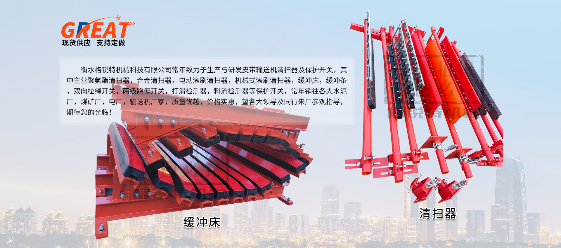 衡水格銳特機(jī)械科技有限公司常年致力于生產(chǎn)與研發(fā)皮帶輸送機(jī)清掃器及保護(hù)開關(guān),其中主營(yíng)聚氨酯清掃器,合金清掃器,電動(dòng)滾刷清掃器,機(jī)械式滾刷清掃器,緩沖床,緩沖條,雙向拉繩開關(guān),兩級(jí)跑偏開關(guān),打滑檢測(cè)器,料流檢測(cè)器等保護(hù)開關(guān),常年銷往各大水泥廠,煤礦廠,電廠,輸送機(jī)廠家,質(zhì)量?jī)?yōu)越,價(jià)格實(shí)惠,望各大領(lǐng)導(dǎo)及同行來廠參觀指導(dǎo),期待您的光臨?。。?/p>